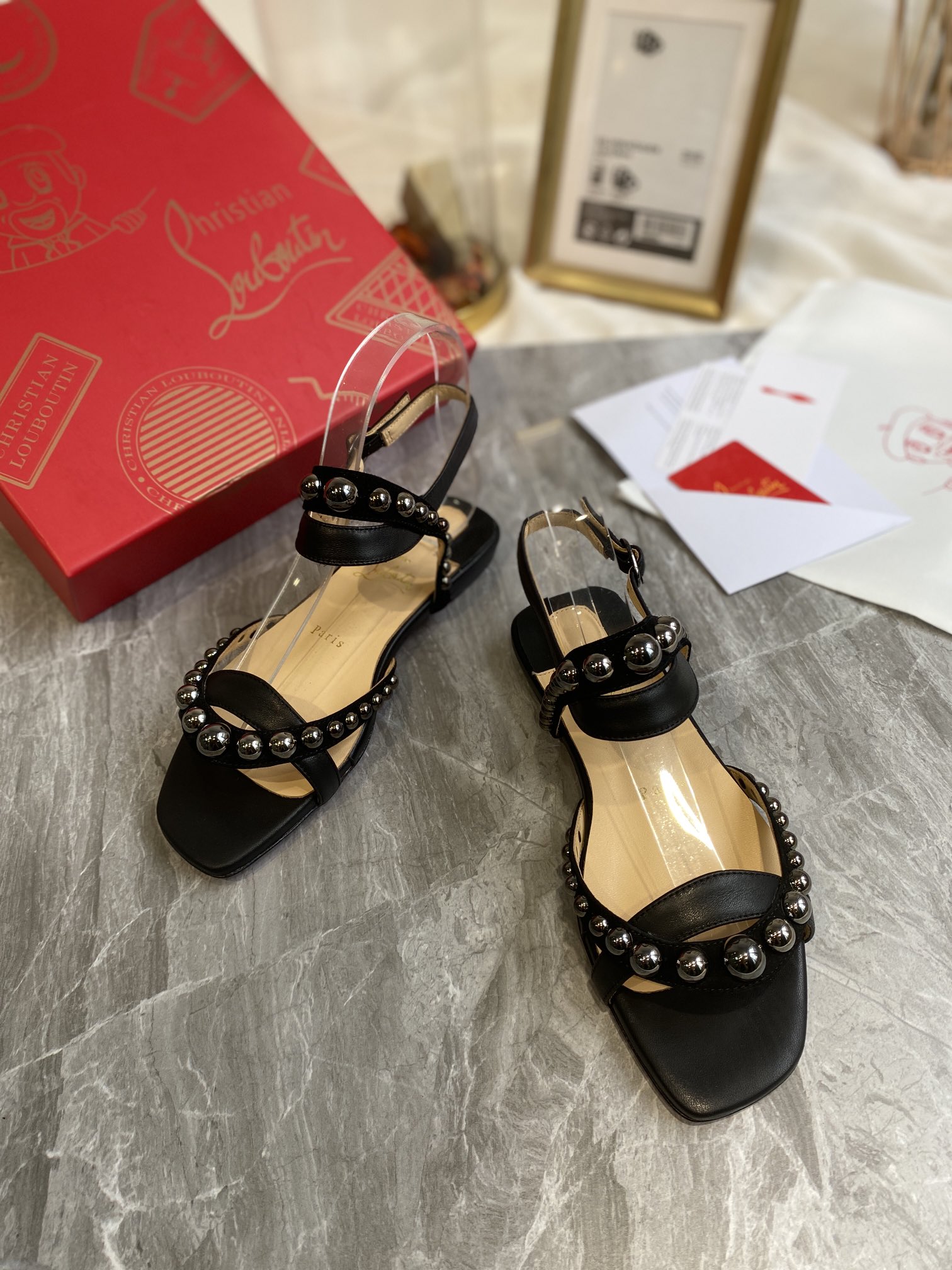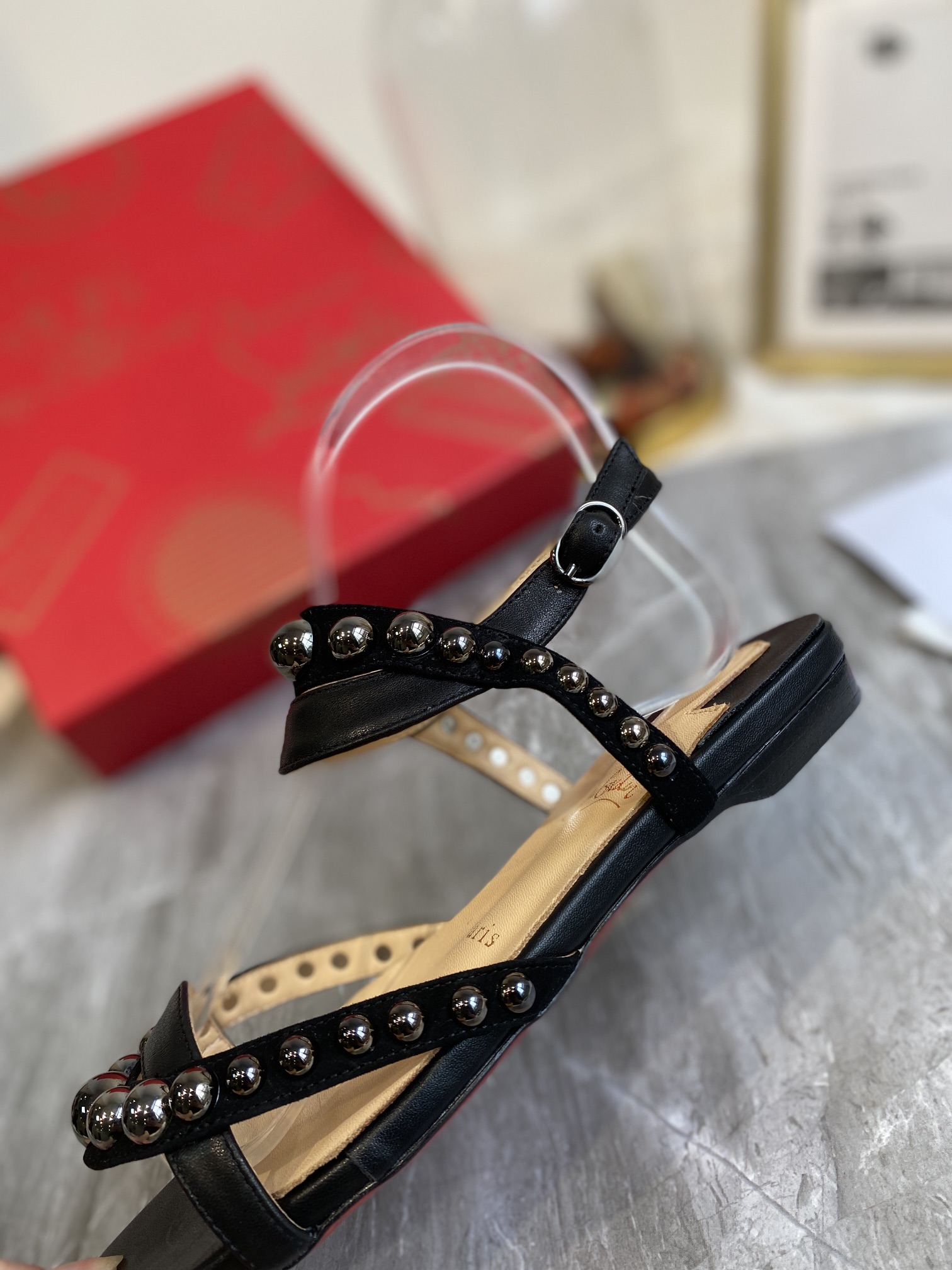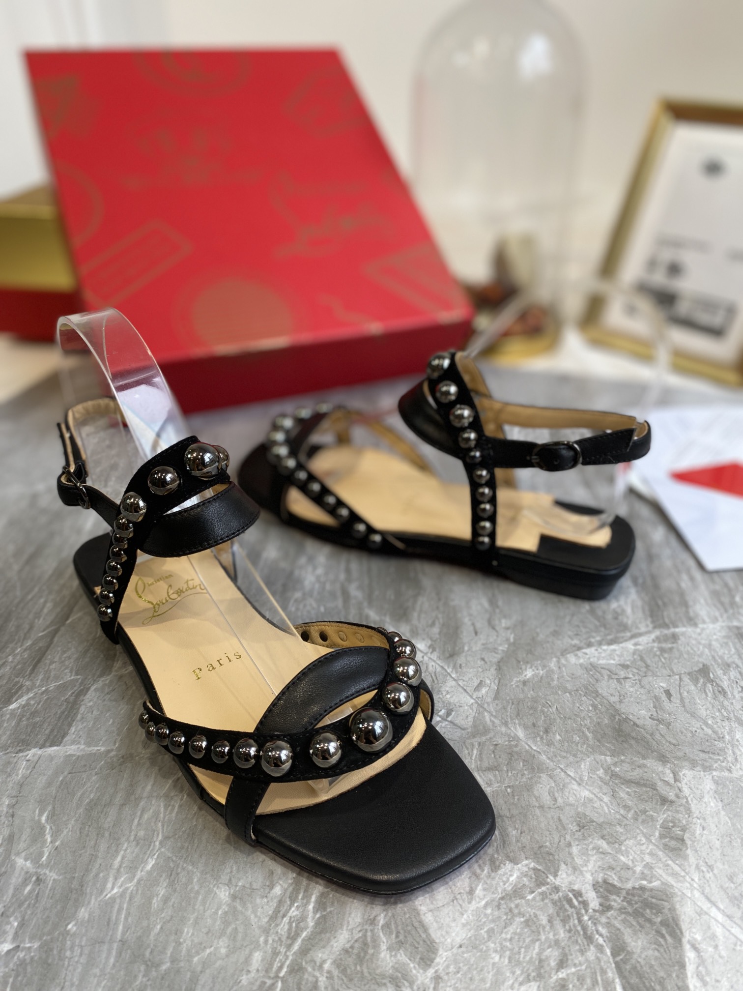 Christian Loubouti Classic Red Soled Flat Sandals With Two Beaded Nails Size 35-43