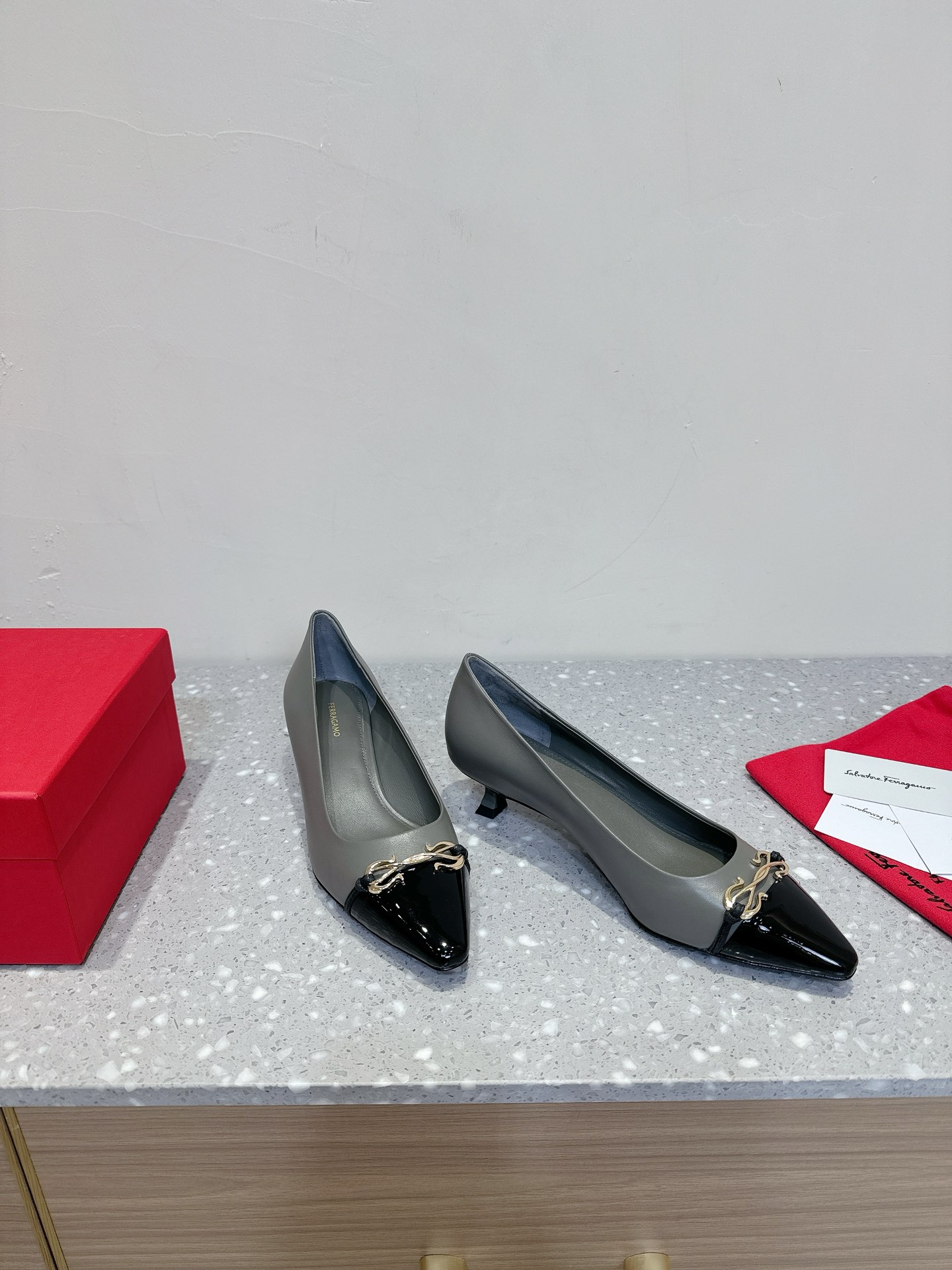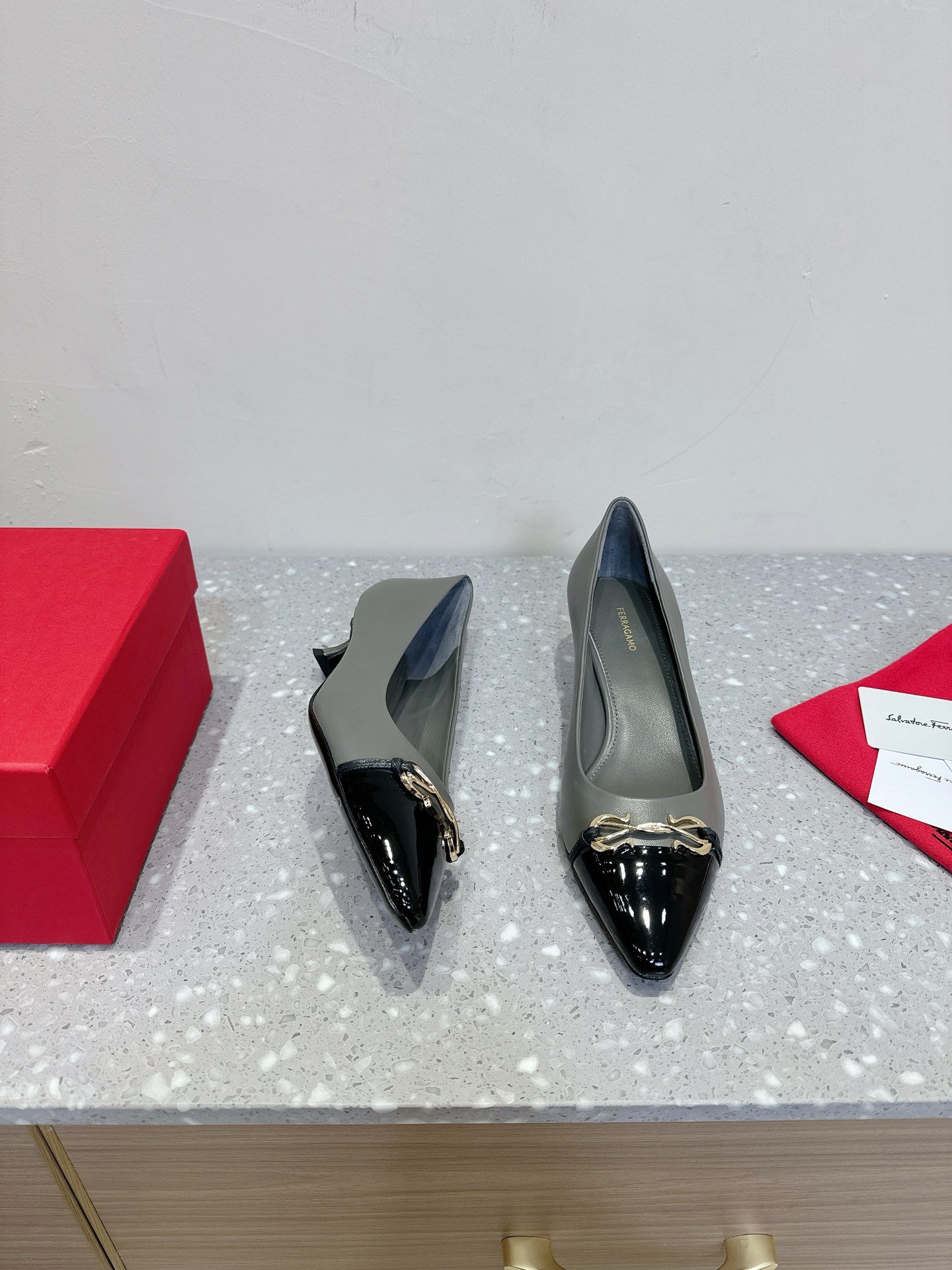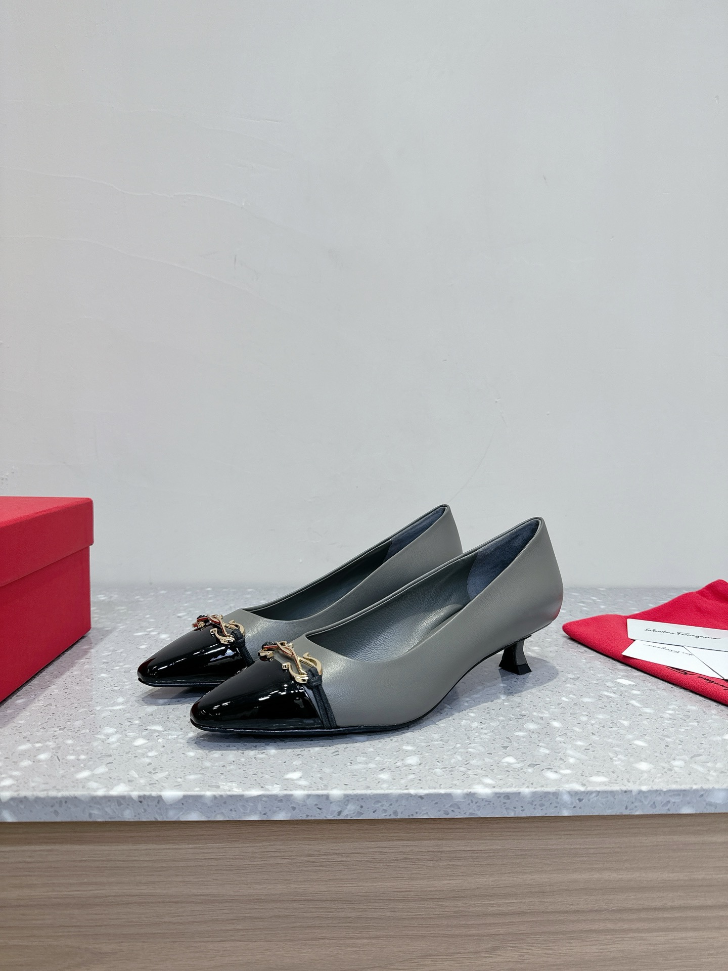 Ferragamo New Hardware Cat Thick Heels Patent Leather Shoes Size35-40